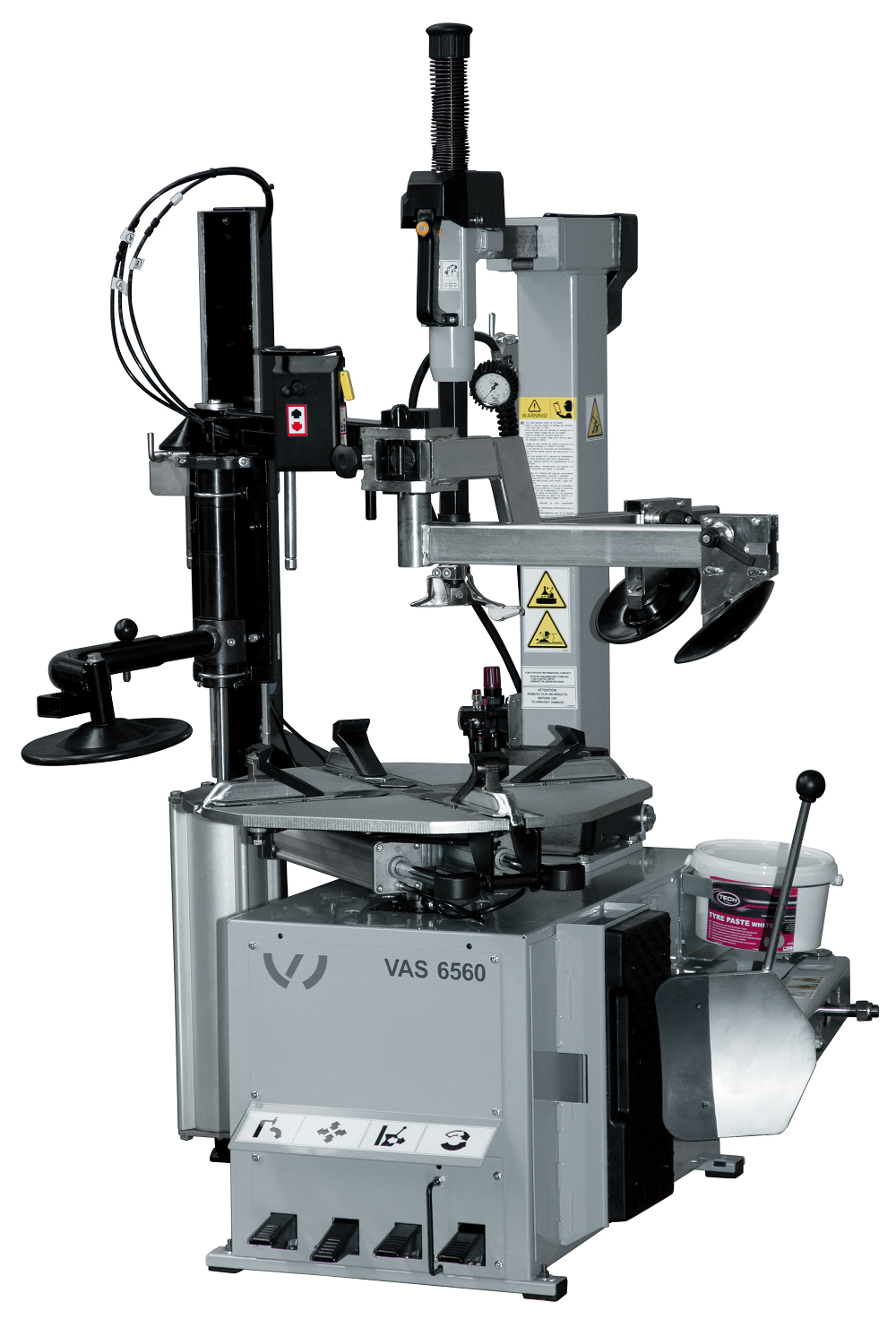 Montážní stroj s do boku se odklápějícím ramenem ovládaným pedálem